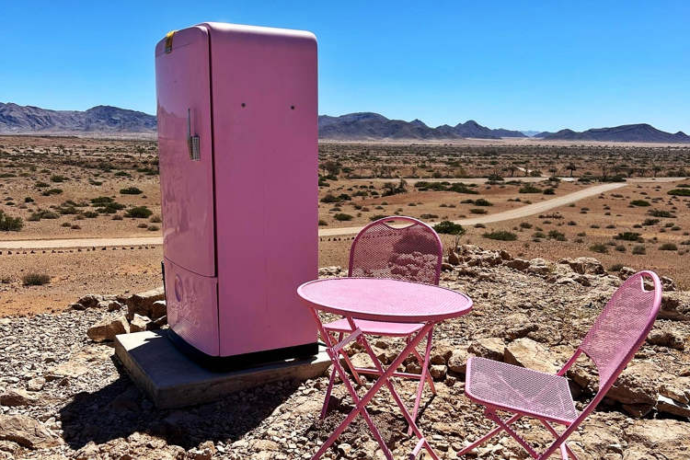 Представьте себе, что вы идете по африканской пустыне, где до самого горизонта только скалы и бесплодные горы, и вдруг натыкаетесь на розовый холодильник и металлический стол с двумя маленькими стульями рядом. Звучит как один из тех печально известных пустынных миражей, но этот холодильник, вдохновленный Барби, не только настоящий, он еще и работает, и его постоянно пополняют освежающие напитки.
