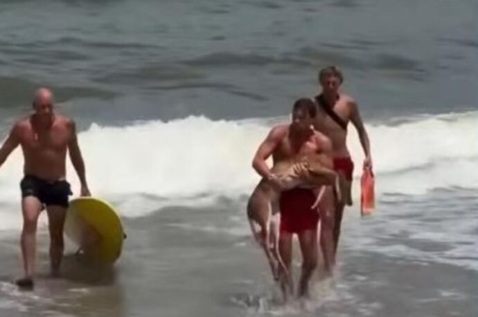 Старший спасатель Флаглер-Бич Чейз Хантер и спасатель-новичок Лео Питерс в воскресенье бросились в воду , когда заметили оленя, барахтающегося в бурной воде во время сильного дождя.
