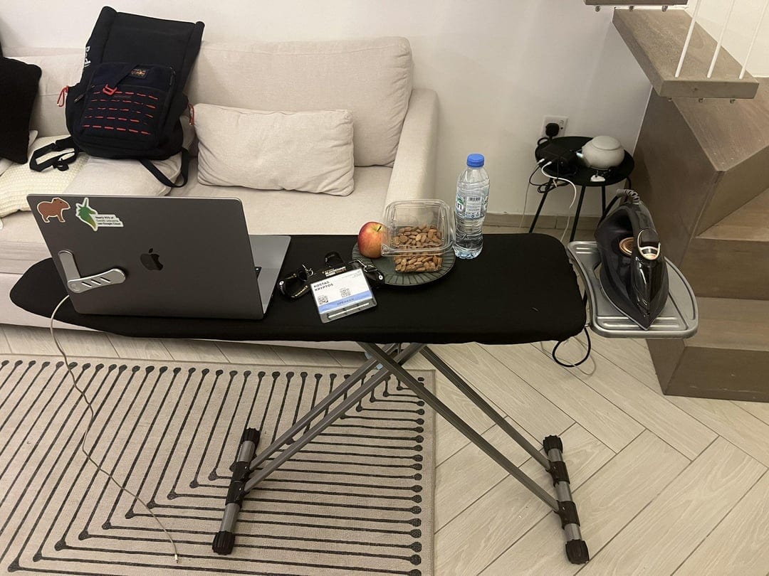 В отелях обычно есть вот такой регулируемый по высоте стол. Не кажется ли он вам удобным?