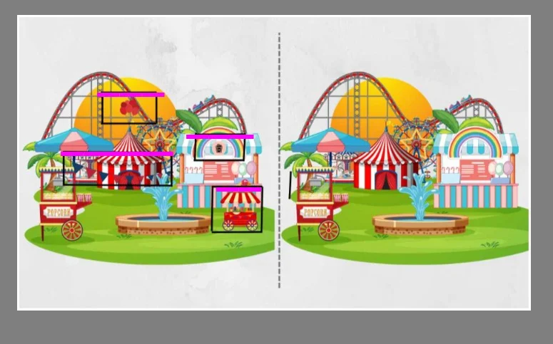 Сегодня тебе предстоит сравнить две картинки с изображением парка развлечений. На первый взгляд они совершенно одинаковы, но на самом деле между ними есть 4 отличия.
