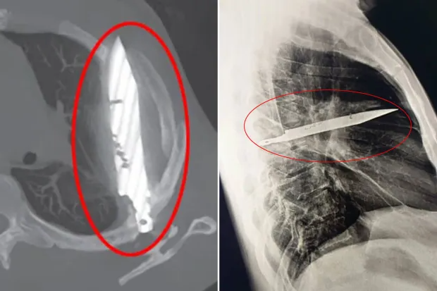«Первоначальная визуализация с помощью боковой рентгенограммы грудной клетки выявила застрявший металлический предмет в средней части грудной клетки, а окружающее затемнение, вероятно, представляет собой рассасывающуюся или хроническую осумкованную гематому или посттравматический фиброз — последствие ножевого ранения пациента», — написали врачи в своем исследовании случая .