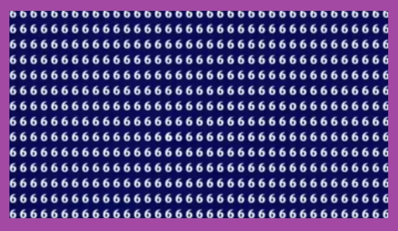 На изображении, которое представлено ниже, вы увидите множество цифр 6, расположенных в строки и столбцы на синем фоне. На первый взгляд всё выглядит совершенно одинаковым. Но внимательный человек сможет заметить, что среди многочисленных шестерок затерялась одна-единственная другая цифра – 0.