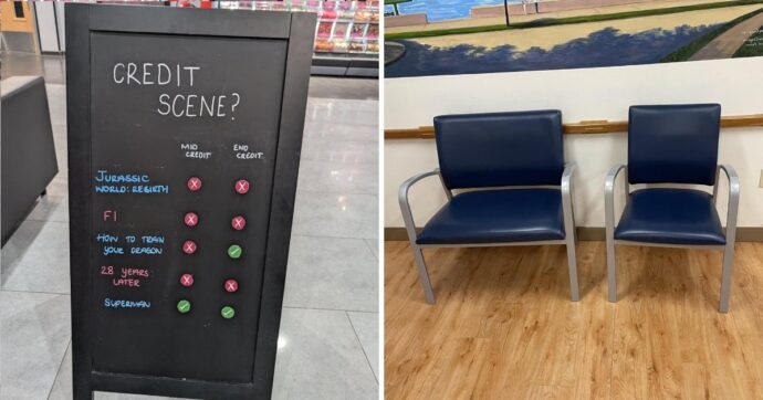 В этом кинотеатре есть табличка, на которой указано, в каких фильмах есть сцена в середине или в конце титров