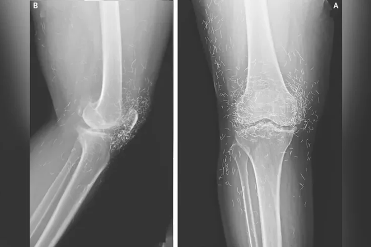 Рентгеновское исследование выявило утолщение и уплотнение внутренней части большеберцовой кости, костные разрастания в колене – все типичные симптомы остеоартрита, – а также сотни крошечных золотых нитей, вросших в ткани вокруг колена. Врачи предупреждают, что акупунктура золотыми нитями не имеет научно доказанной пользы для пациента, но сопряжена со множеством известных рисков. Крошечные нити могут вызывать образование кист, мигрировать в организм и повреждать окружающие ткани, а также сделать невозможным проведение МРТ, потенциально спасающей жизнь, из-за риска смещения металла и повреждения кровеносных сосудов.
