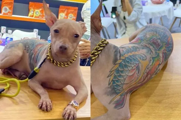 На вирусных фотографиях видно, что спина мексиканской голой собаки покрыта яркими татуировками , в центре которых изображена морда дракона. Тело дракона занимает всю спину собаки и даже простирается до верхней половины её конечностей. На снимках собака также щеголяет большой золотой цепочкой и наручными часами на одной из передних лап.