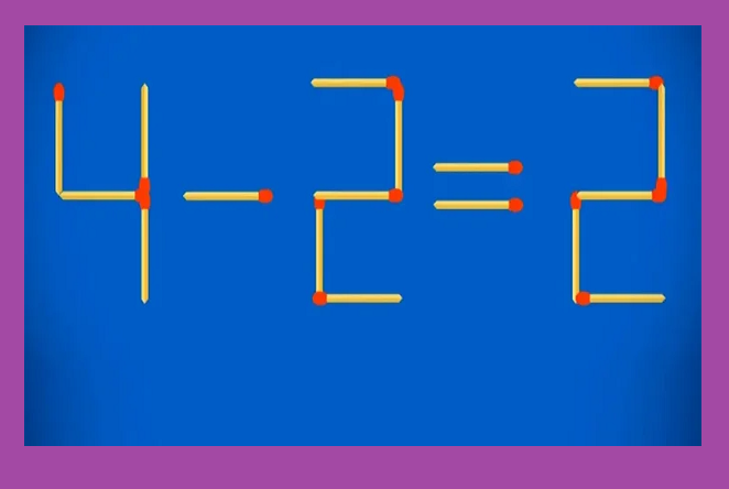 Затем переместите спичку из нижнего правого угла наружу. Таким образом, коварная пятерка превращается в двойку! Итог: Теперь всё на своих местах: 4 – 2 = 2.