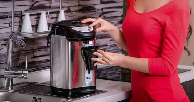 Горячую воду из термопота можно налить нажатием кнопки на корпусе, нажатием чашки на клапан или посредством ручной помпы.