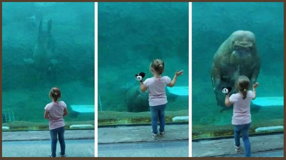На кадрах можно увидеть, как гигантское животное дружелюбно приветствует девушку в вольере «Land of the Cold» («Страна холода»), расположенном в Зоопарке Пайри Дайза в…