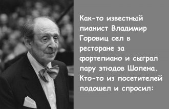 Представляем Вам забавные случаи из жизни великих музыкантов и композиторов. Вы где-то учились? Как-то Владимир Горовиц сел в ресторане за фортепиано и сыграл пару…