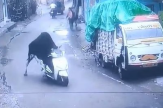 Камера видеонаблюдения на улице в Ришикеше, Уттаракханд, Индия, запечатлела момент, когда бродячий бык покатался на припаркованном скутере. На видео видно, как бродячий бык исследует…