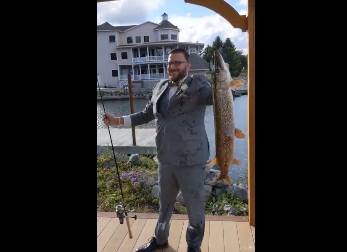 «Мы с женой Мишель поженились на пристани для яхт «Bald Eagle». Я держу там свою лодку для ловли лосося, из-за COVID нам пришлось устроить свадьбу поменьше, — поведал он ViralHog. — Мы поженились прямо на воде, в ожидании прибытия Мишель, я спустится с пристани, взял удочку и подцепил на неё щуку, клюнувшую на наживку для лосося.»