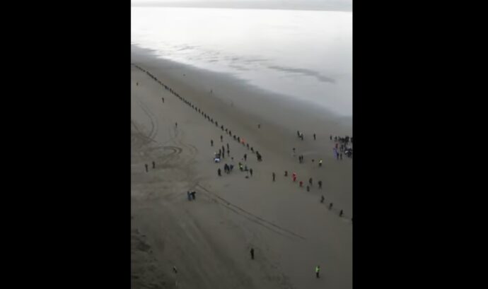Фонд Колега сэра Гара, Клуб молодых фермеров Уэльса и загородный парк Пембри объединились на пляже парка Сефн Сидан, чтобы потянуть за противоположные концы длинной веревки.